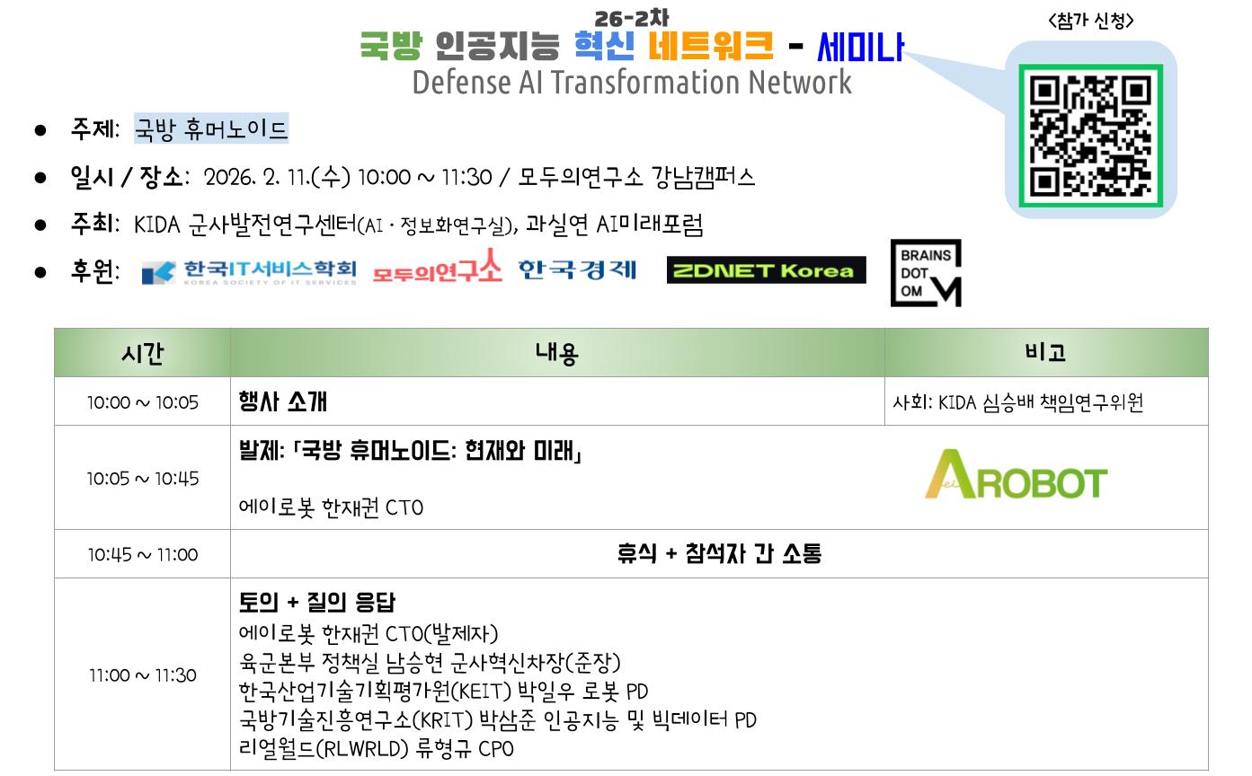 - 주최: 한국국방연구원 군사발전연구센터(AI·정보화연구실), 과실연 AI미래포럼